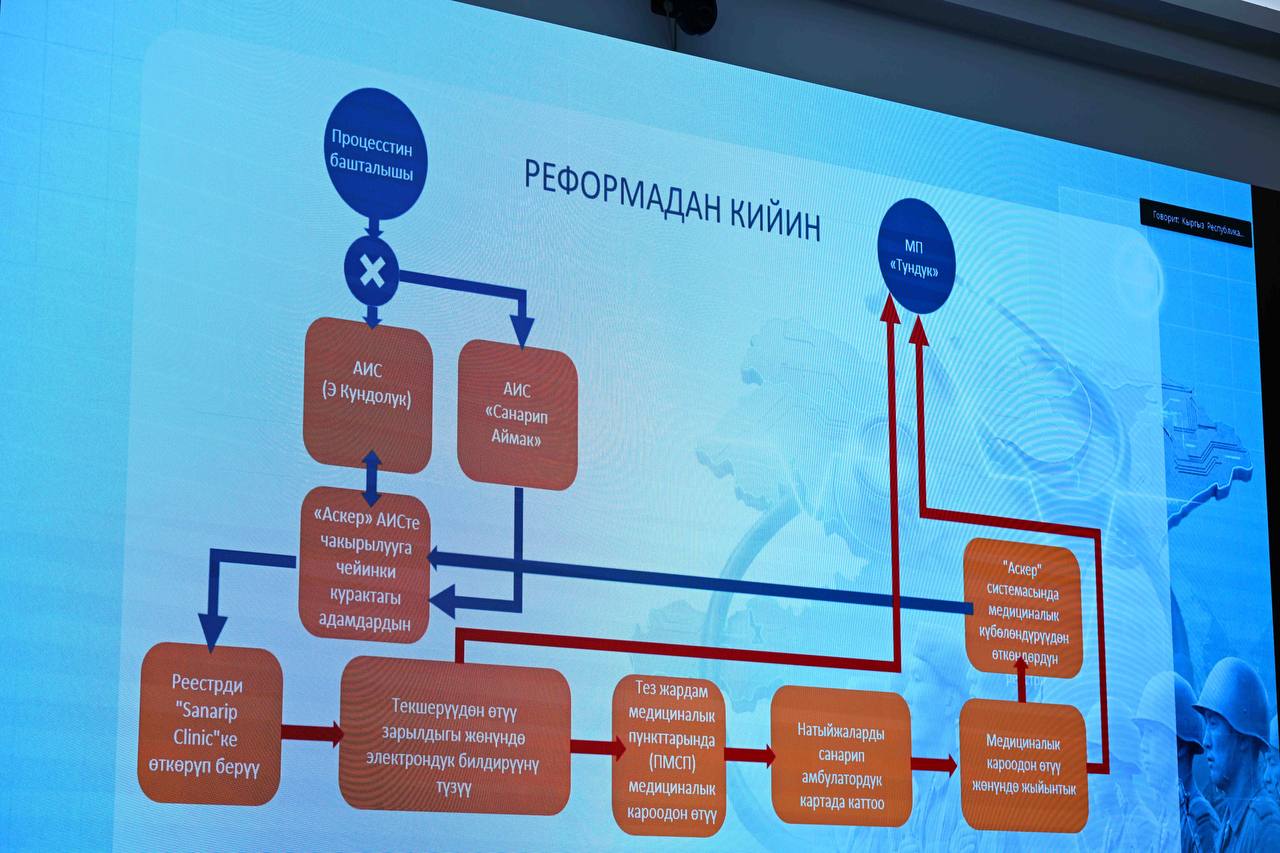 “Бүгүнкү күндө медициналык кароолор биринчи кезекте аскер комиссариаттарында жүргүзүлүп жатат, бул текшерүүлөрдүн сапатын төмөндөтүп, саламаттыкты сактоо тармагына оорчулукту жаратууда. Жылына болжол менен 180 000 адам медициналык кароодон өтүшөт, анын ичинде 50 000ге жакыны аскерге чакырылганга чейинки кызматкерлер. Республикадагы адистештирилген медициналык адистердин 34%зы аскердик медициналык комиссияны колдоо көрсөтүү үчүн 9 айга чейин иштөөгө бурулган. Реформа бирдиктүү электрондук реестрди түзүү, медициналык текшерүүлөрдү баштапкы медициналык-санитардык жардам уюмдарына өткөрүп берүү, “Түндүк” мобилдик тиркемеси аркылуу даректүү маалыматты киргизүү, медициналык кароонун жыйынтыгын толук санариптештирүүгө кирет, – деп белгиледи МинКаб Төрагасы.