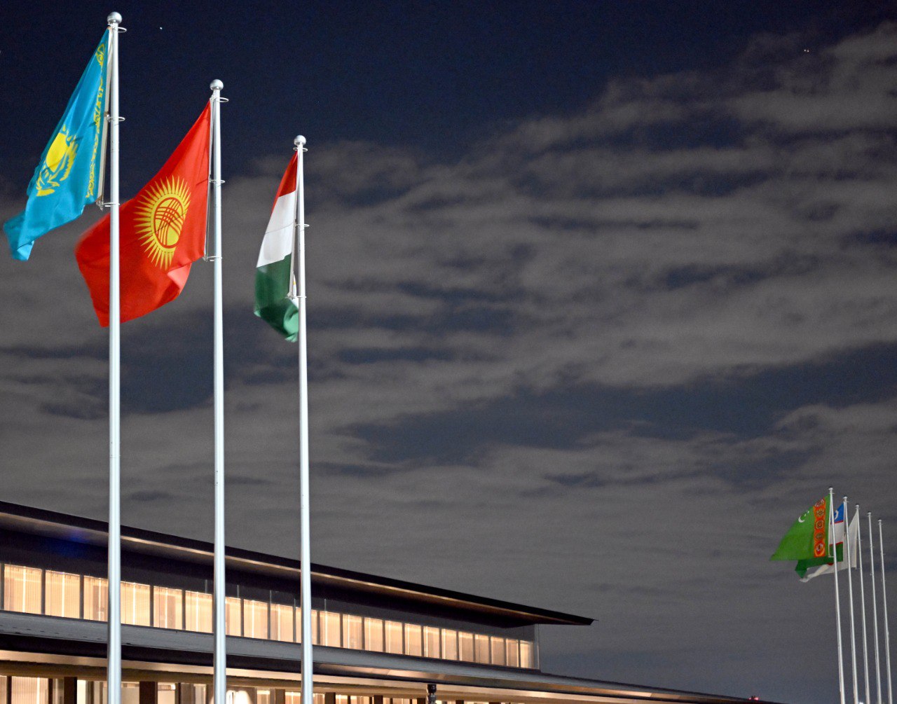 Аэропортто Борбор Азия өлкөлөрүнүн мамлекеттик желектери илинип, килем төшөлгөн.