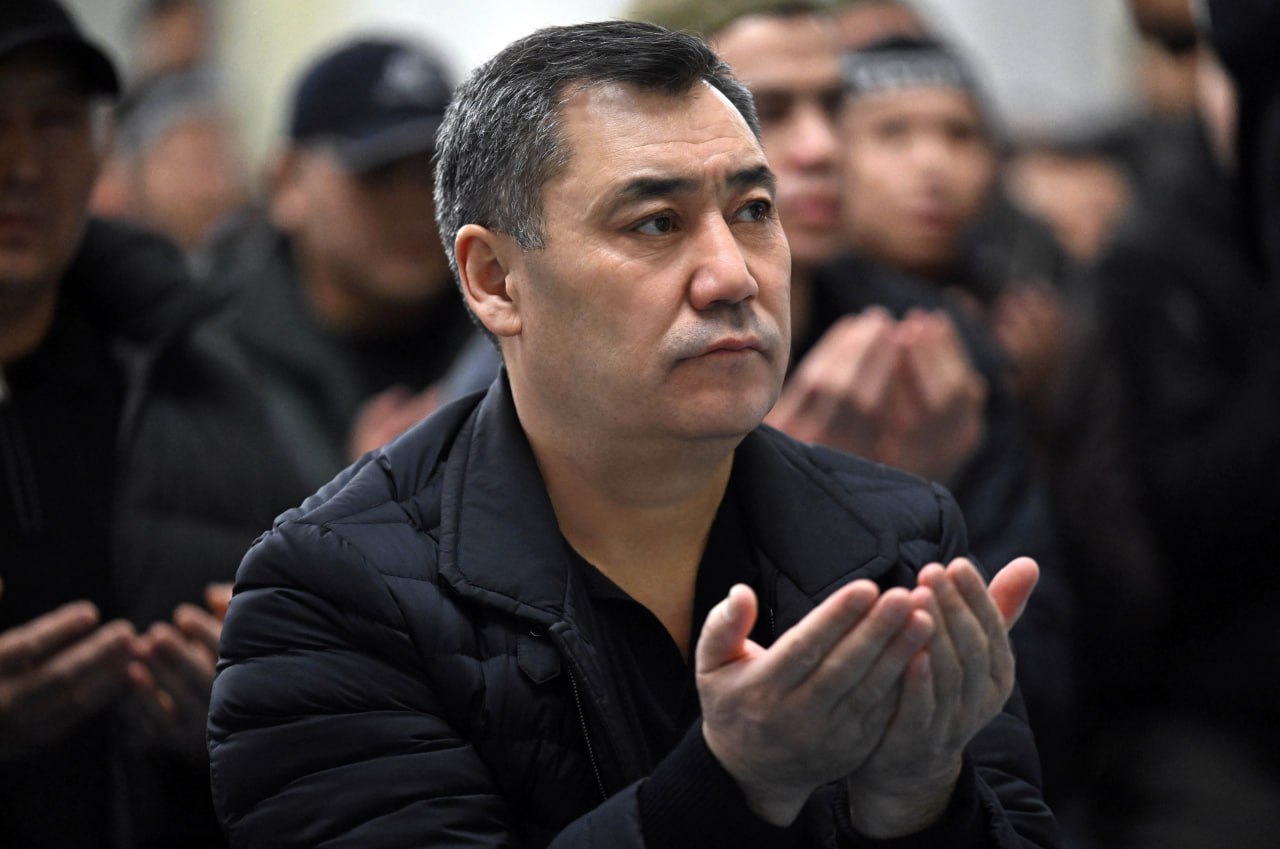 Далее президент принял участие в ооз ачуу вместе с прихожанами мечети и совершил намаз.