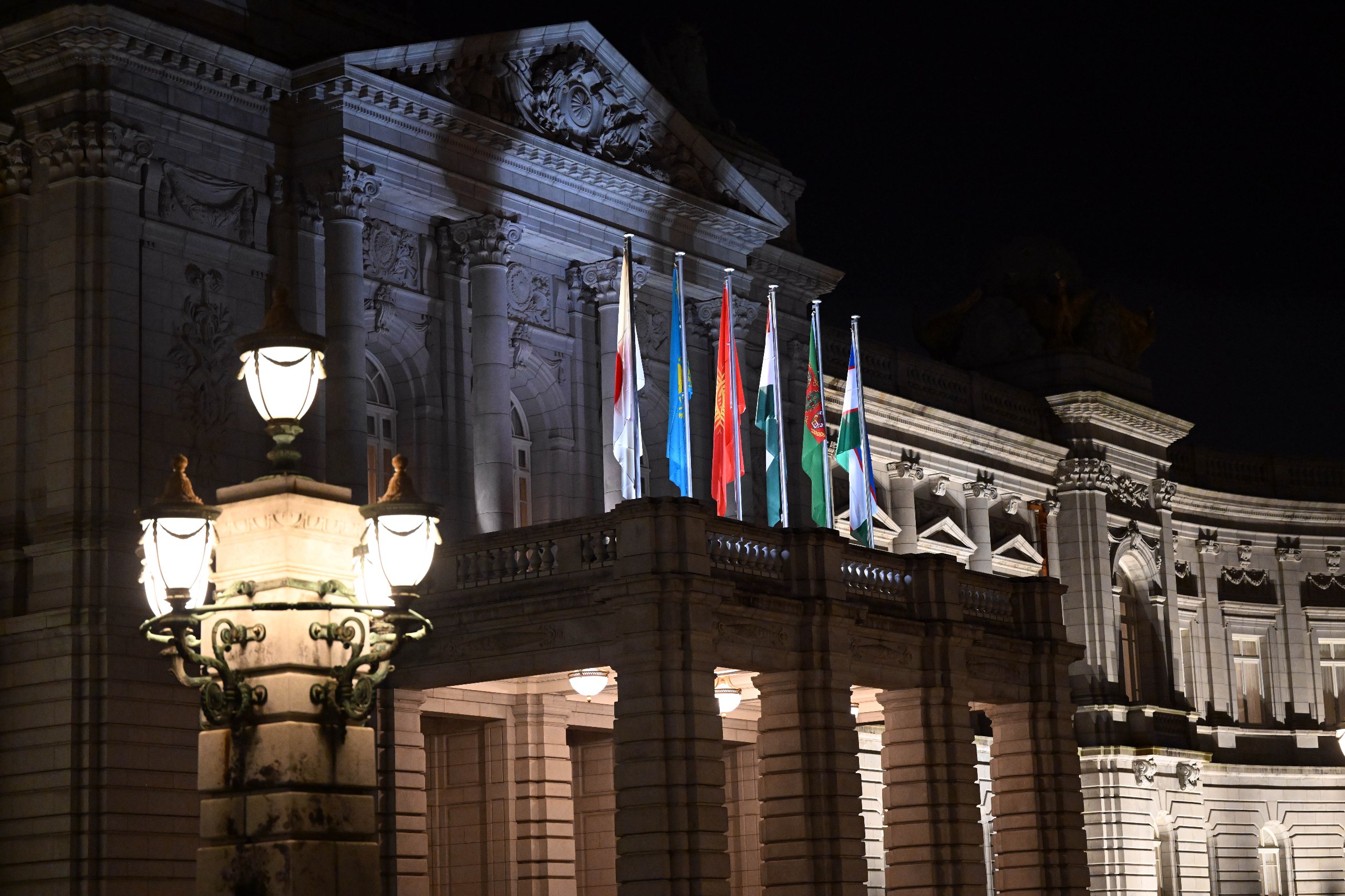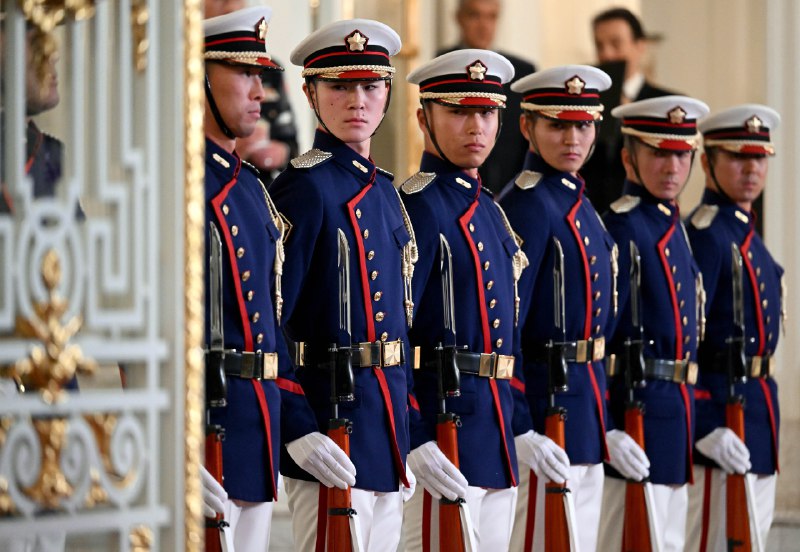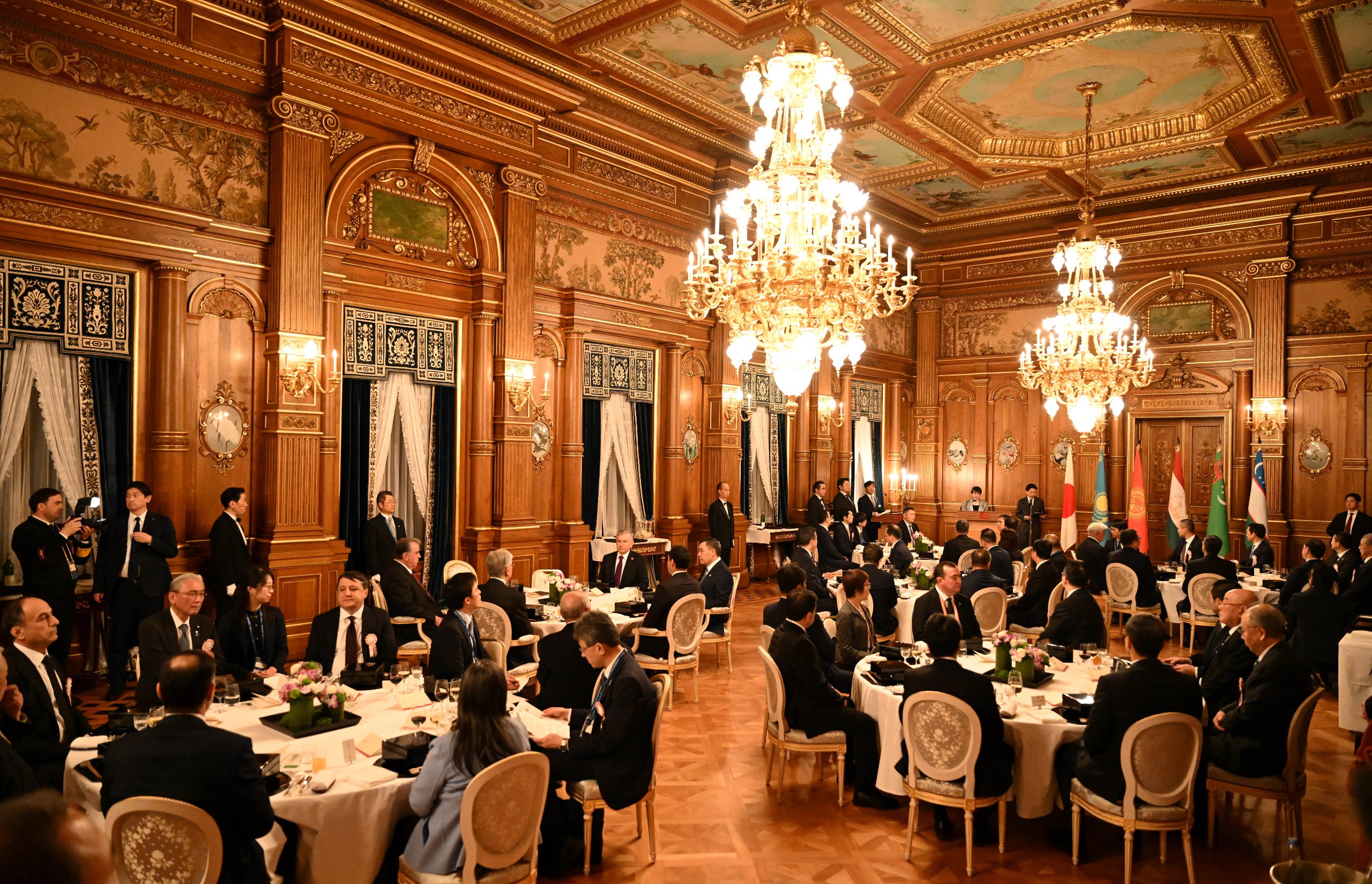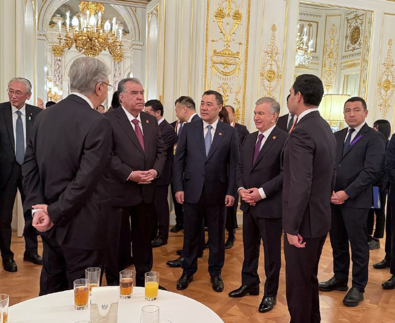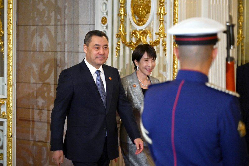 Андан соң Президент Садыр Жапаров менен Япониянын Премьер-министри Санаэ Такаити ардактуу кароол ротасынын жанынан кызыл килем үстүнөн өтүшүп, биргелешип сүрөткө түшкөндөн кийин Борбор Азия өлкөлөрүнүн лидерлеринин урматына уюштурулган тосуп алуу кечки тамагына катышуу үчүн залга өтүштү.
